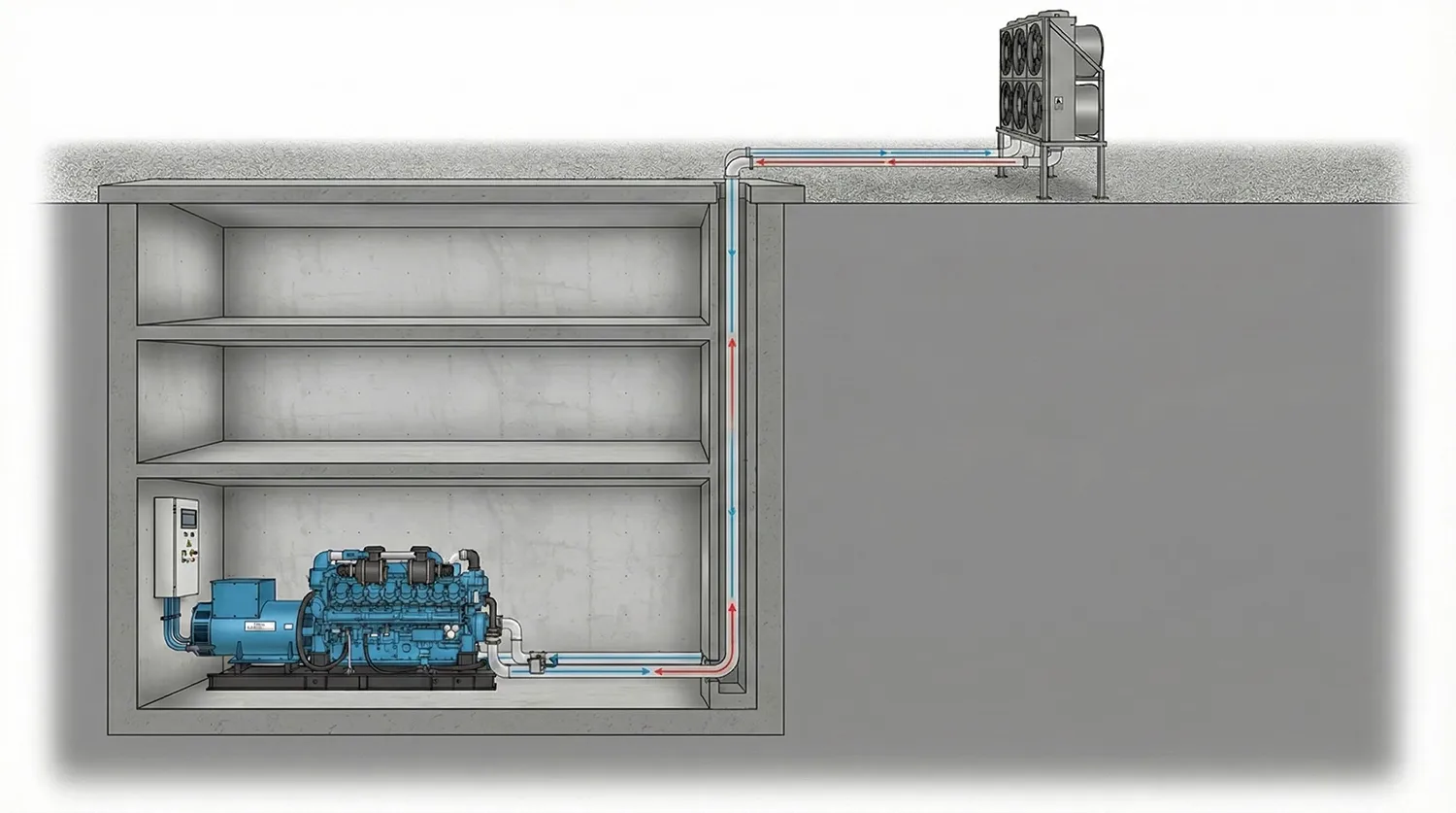 To prevent this power derating, the radiator system can be installed remotely, away from the generator set and directly exposed to fresh ambient air.